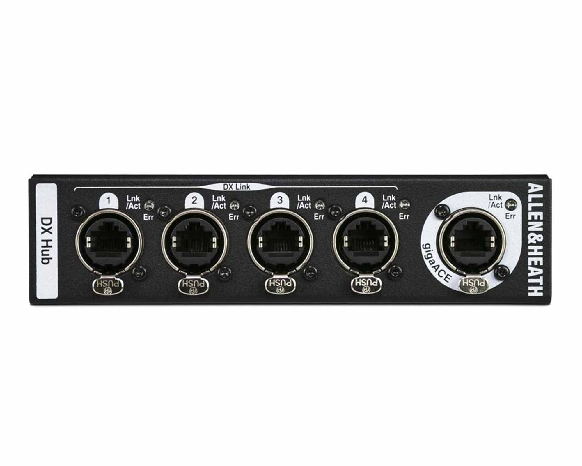 The DX Hub is a remote audio networking hub that can be connected to any Allen & Heath SQ mixer, or dLive system fitted with a gigaACE I/O module. It provides 4 DX Link ports each carrying 32×32 channels of 96kHz audio, that can be used to connect to DX expander units.