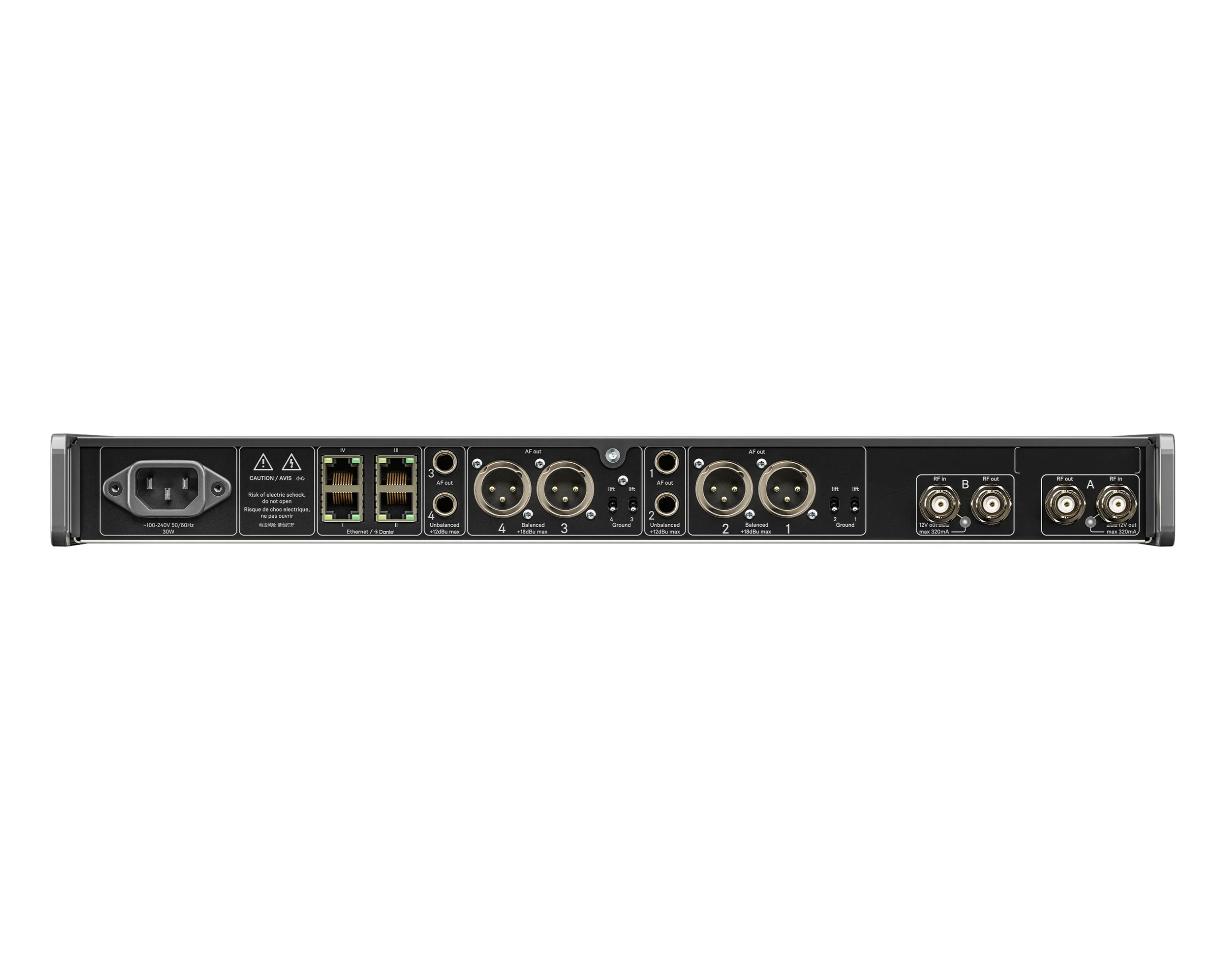 All the above, plus Dante‑networking on the rear panel. Send two pristine audio streams over a single CAT 5 cable into your AV‑over‑IP system, ideal for modern FOH and broadcast rigs.